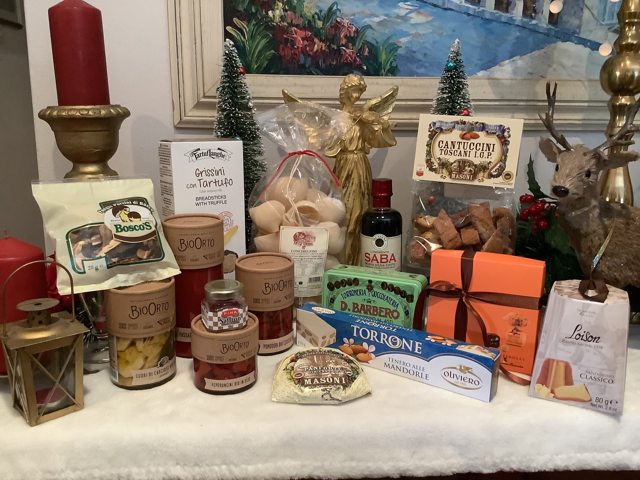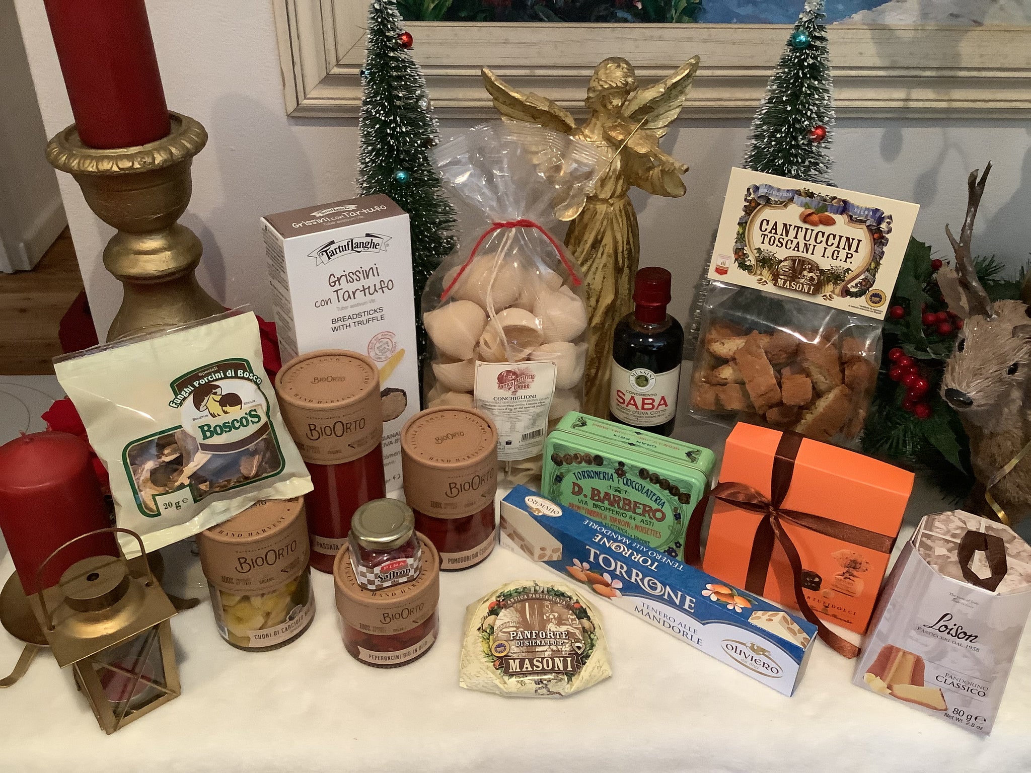 All the included products originate from Puglia and are certified organic. A replacement will be provided if any items are unavailable, ensuring the same or higher quality. This basket includes 350g jars of sun-dried tomatoes and artichokes, 30g of porcini mushrooms, truffle-infused grissini, 500g of conchiglioni pasta from Puglia, 350g of pistachios from Bronte, 50g of traditional almond nougat, Antica Dolceria Piemontese truffle chocolate, 150g of Tuscan cantucci, 250ml of balsamic vinegar from Modena, and a small 80g panettone.