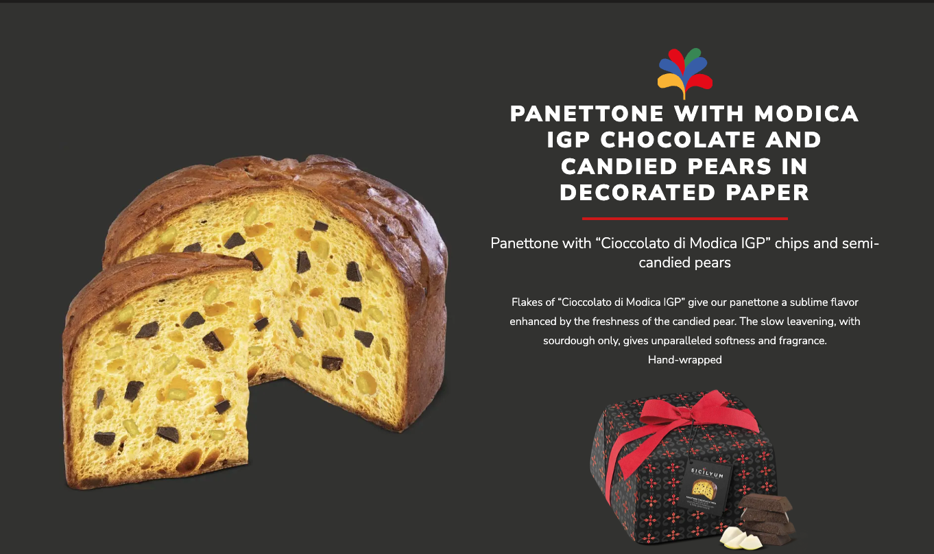 Studded with luxurious dark chocolate pieces and delicately candied Sicilian pear, each slice offers a harmonious balance of rich cocoa depth and gentle fruity sweetness. Made using time-honoured Sicilian pastry techniques and premium ingredients, it reflects true Italian craftsmanship and festive refinement.
